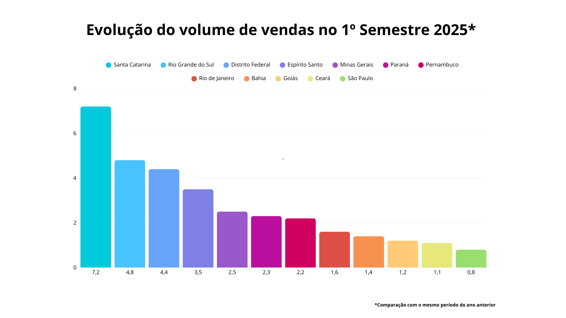 No recorte estadual, Santa Catarina novamente se destacou, com crescimento de 9,0% no volume de vendas. Outros estados com desempenho expressivo foram o Distrito Federal (9,3%), Bahia (8,6%), Paraná (7,7%), Minas Gerais (7,3%) e Rio de Janeiro (6,5%). Já entre os menores resultados, o Rio Grande do Sul avançou 0,9%, Ceará 0,7% e o Espírito Santo 2,3%.