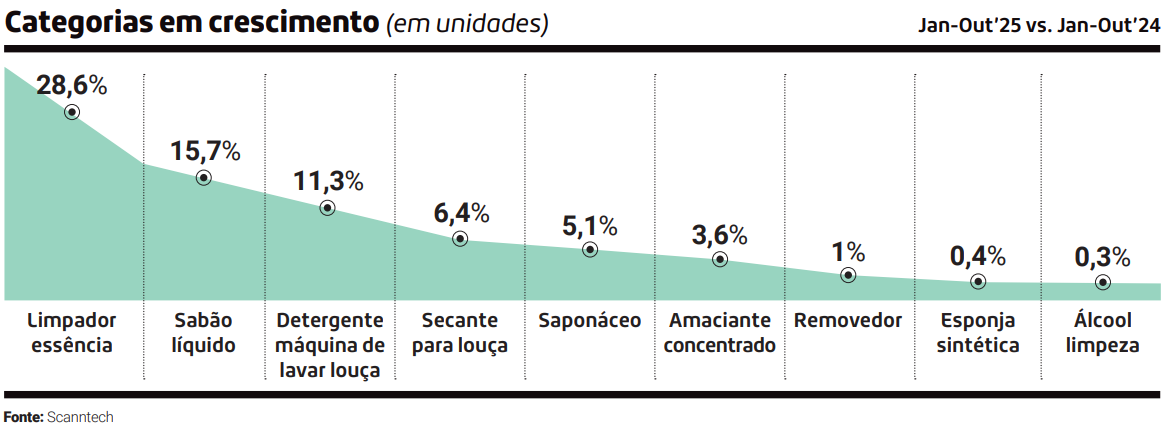 A indústria brasileira já se prepara para absorver a demanda: atingiu seu pico histórico em 2024, com alta de 9,1% nos índices de produção, apontam dados da Abipla (Associação Brasileira das Indústrias de Produtos de Higiene, Limpeza e Saneantes de Uso Doméstico e de Uso Profissional).