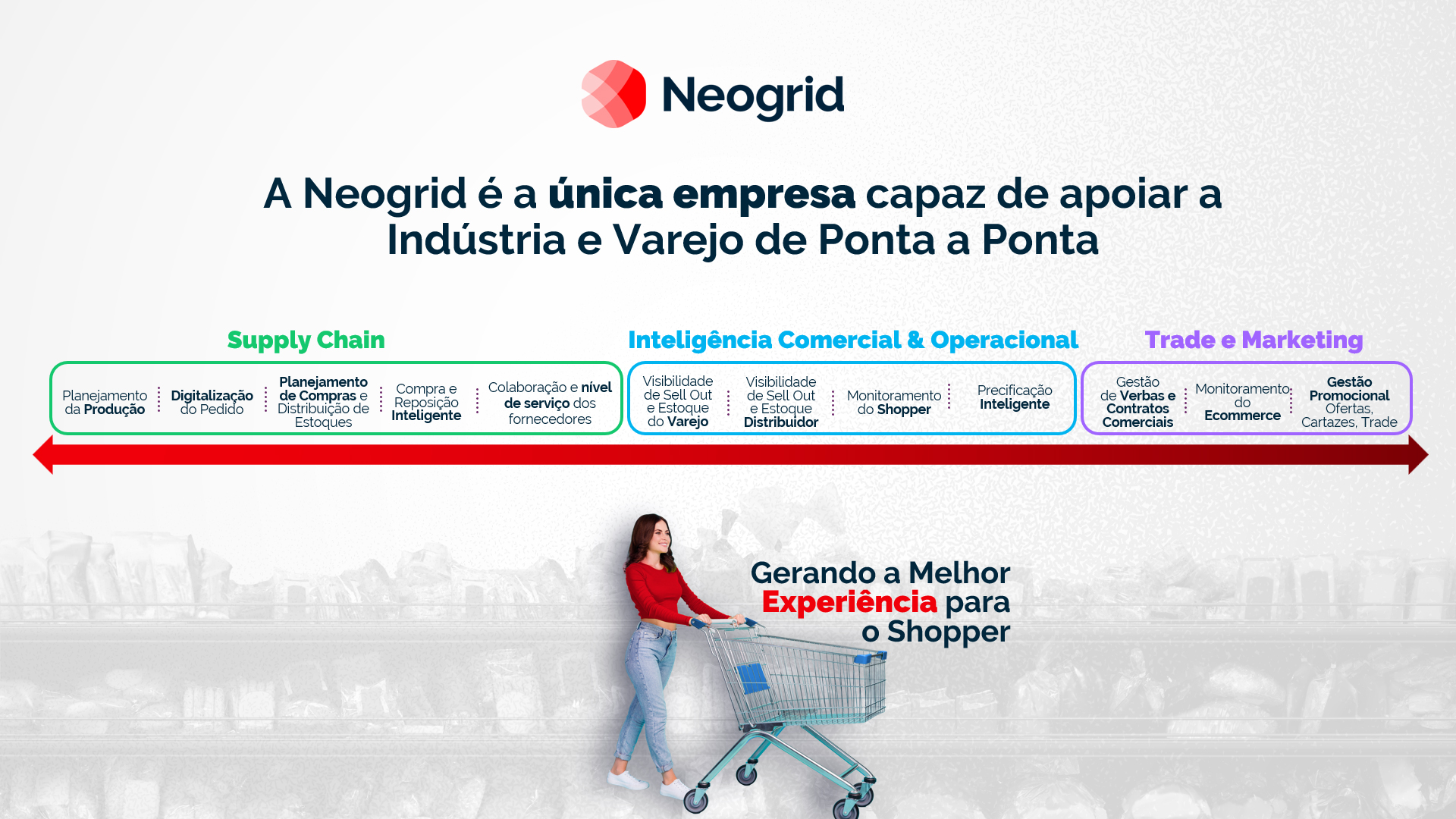 Por isso, a Neogrid vem apostando na lógica deuma verdadeira mudança das regras de negócio e da cultura do setor, a partir de uma integração ponta a ponta, com soluções conectadas que geram valor em diferentes camadas da operação.