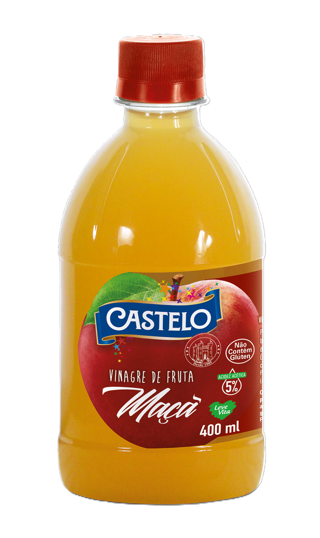 O Vinagre de Maçã 100% Natural Castelo chega na versão PET 400 ml como uma evolução da linha Sem Conservantes, antes disponível apenas em vidro de 500 ml. Natural e sem conservantes ou aditivos químicos, ele mantém a acidez de 5%, ideal para diversas preparações culinárias, preservando o mesmo padrão de sabor, os benefícios para saúde e a qualidade da versão em vidro.